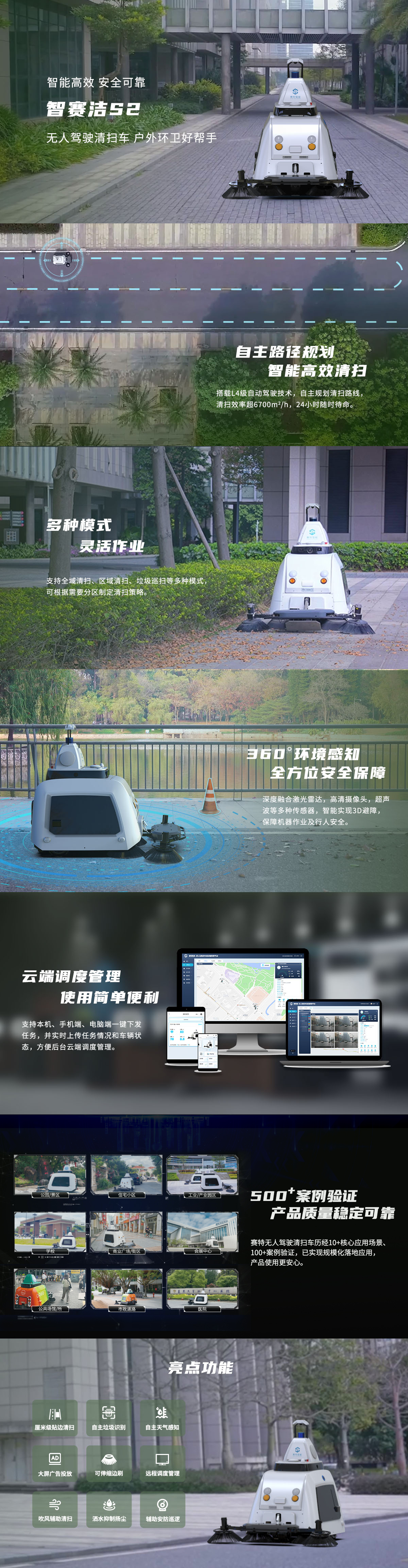 无人驾驶清扫车S330具备区域自规划清扫、零间隙贴边清扫、全遍历清扫等多种作业模式,结合自主充电、自主加水、自主倒垃圾等高度智能化功能